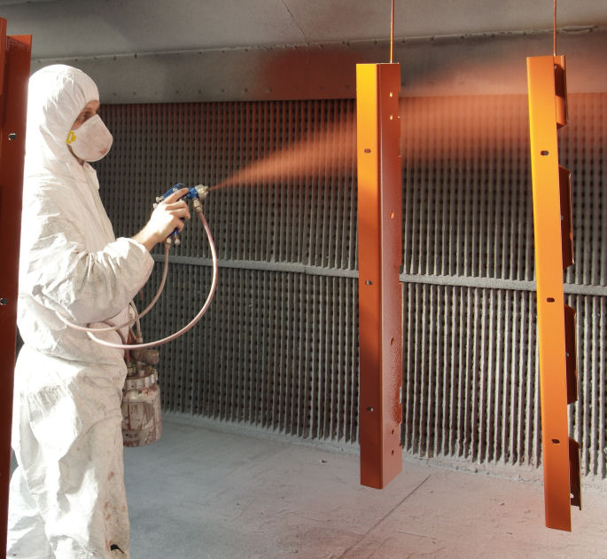 Painting is via the wet spray method typically using solvent based paints. We can also apply two pack epoxy paints and water based according to your needs. Our standard finish is a zinc rich primer applied over shotblast finish. Typical thickness is around 30 microns. We can supply most colour finishes to BS 4800, BS 381C and RAL. Our expertise runs to high specification paint work suitable for coastal applications as well as rail standard work and corrosive atmosphere special finishes